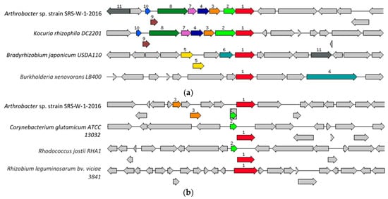 Shown are (a) the chromosomal region of the cobalt/zinc/cadmium subsystem gene (1056 bp) in Arthrobacter sp. strain SRS-W-2-2016 relative to four other organisms and (b) the HoxN/HupN/NixA family nickel/cobalt transporter gene (1089 bp) in Arthrobacter sp. strain SRS-W-2-2016 relative to four other organisms. The graphic is centered on the focus gene, which is red and numbered 1. Sets of genes with a similar sequence are grouped with the same number and color. Genes whose relative position is conserved in at least four other species are functionally coupled and share gray background boxes.