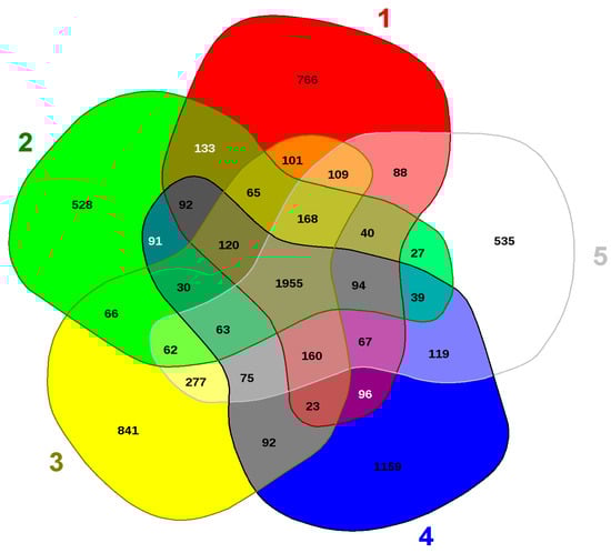 Shown are the whole genome-based Venn diagrams generated between Arthrobacter sp. SRS-W-1-2016 with its closest functional relatives. Venn diagram sectors belong to 1, Phenarthrobacter aurescens TC1; 2, Arthrobacter cupressi strain CGMCC; 3, Arthrobacter globiformis strain NBRC12137; 4, Arthrobacter sp. SRS-W-1-2016; and 5, Pseudoarthrobacter phenanthrenivorans strain Sphe3. The number of singleton genes appear in red, green, yellow, blue, and white areas for strains 1–5 listed above, respectively -along with their core genomes (centered gray area).