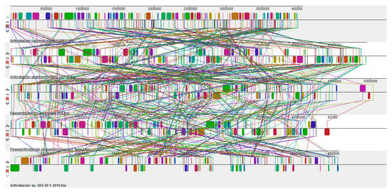Further comparative genomic analysis to identify the presence of large-scale evolutionary events, such as rearrangements and inversions, was performed by the multiple alignment of strain SRS-W-1-2016 with Paenarthrobacter aurescens TC1, A. cupressi strain CGMCC1, A. globiformis strain NBRC 1237, and Pseudoarthrobacter phenanthrenivorans strain SWC37, which revealed the presence of several crisscrossing locally collinear blocks (LCBs), suggesting the complicated rearrangement history of strain SRS-W-1-2016 relative to related Arthrobacter genomes. Regions that are inverted relative to strain SRS-W-1-2016 appear shifted below a genome’s center axis (Figure 8). In fact, visual inspection of the genomic rearrangement pattern for strain SRS-W-1-2016 relative to other Arthrobacter species revealed several instances of local overlapping inversions characteristic of symmetric inversion about the terminus, distinguishable as a “fan” pattern of crossing lines. Therefore, we hypothesize that the genomic collinearity of strain SRS-W-1-2016 was lost relative to its closest taxonomic relatives, most likely due to evolutionary mechanisms associated with genomic inversions and other rearrangements.