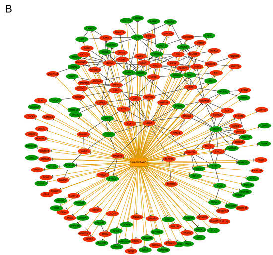 Furthermore, 768 potential target genes of hsa-miR-429 were predicted and 172 of them were MDEGs, including 98 up-regulated ones and 74 down-regulated ones. In the miRNA–target network of 172 MDEGs and hsa-miR-429 (Figure 2B), RHOA interacted with 15 MDEGs. ZEB1, shown in Table 1, was predicted to be a TF targeting hsa-miR-429, and is known to inhibit the translation of hsa-miR-429 [45].