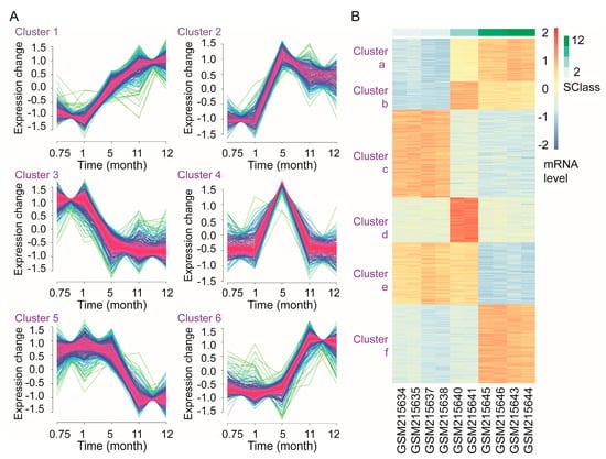 As the regulation of gene expression is a dynamic process, it is important to identify and characterize changes in gene expression over time. Arrays collected over a time course allow for the study of the dynamic behavior of gene expression and clustering analysis has been commonly applied to time-course microarray data [36]. GSE8702 [37], a gene transcription profile during the androgen deprivation of LNCaP, was downloaded from the GEO database (http://www.ncbi.nlm.nih.gov/geo/). The raw data for this dataset were generated via the Affymetrix Human Genome U133 Plus 2.0 Array. GSE8702 contained six LNCaP samples cultured in normal medium (control group) and ten LNCaP samples cultured in androgen-deprived medium (deprivation group) for 3 weeks, 1 month, 5 months, 11 months, and 12 months. In our study, samples in the deprivation group were utilized to study the time-course changes in gene transcription during androgen deprivation. After data pre-processing using the Affy package [38], the fuzzy c-means clustering method [39] in Mfuzz software [39,40] was utilized to cluster genes based on their messenger RNA (mRNA) levels at the five time-points. The parameters in the clustering analysis were set as minimum standard deviation = 0.5 and score = 0.6, with a higher score representing a closer clustering. Genes in the Mfuzz-clusters were further clustered, and their transcription levels were shown using pheatmap in R [41].