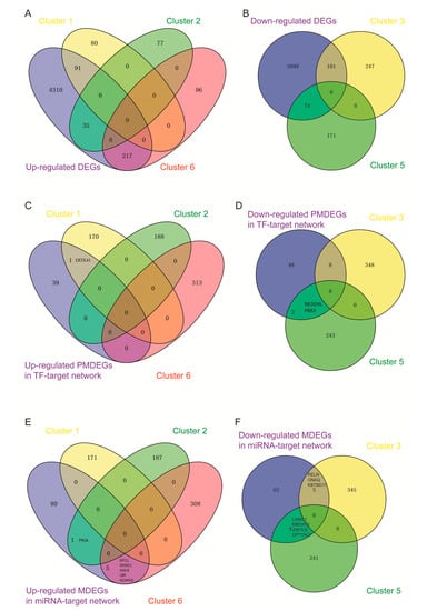 Comprehensive analysis of sequencing and microarray data. (A) Genes in clusters 1, 2, and 6 were compared with the 4653 up-regulated DEGs; (B) Genes in clusters 3 and 5 were compared with the 4074 down-regulated DEGs; (C) Genes in clusters 1, 2, and 6 were compared with the up-regulated PMDEGs in the TF-target network; (D) Genes in clusters 3 and 5 were compared with the down-regulated PMDEGs in the TF-target network; (E) Genes in clusters 1, 2, and 6 were compared with the up-regulated MDEGs in the miRNA–target network; (F) Genes in clusters 3 and 5 were compared with the down-regulated MDEGs in the miRNA–target network. DEGs: differentially expressed genes; TF: transcription factor; miRNA: microRNA; PMDEGs: differentially expressed genes whose promoters overlapped with DMRs; MDEGs: differentially expressed genes that overlapped with DMRs; DMRs: differentially methylated regions.