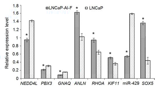 The mRNA expression levels of NEDD4L, PBX3, and GNAQ, as well as hsa-miR-429 were significantly lower in LNCaP-AI-F cells than in LNCaP cells (p < 0.05). Furthermore, the mRNA expression levels of ANLN, RHOA, and KIF11 were significantly higher in LNCaP-AI-F cells than in LNCaP cells (p < 0.05, Figure 5). The results of qRT-PCR were consistent with those obtained via bioinformatics analysis.