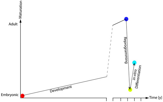 The application of the analysis of DNAm pattern in iPSCs and their derivatives indicate that while reprogramming is associated with a reversion of DNAm patterns to embryonic-like state, the differentiation process does not lead to a full re-establishment of the cellular specific DNAm-profile. These results fit with what emerges from recent reports, indicating that tissues differentiated from iPSCs do not present the same physiological and functional features of the target cells rather than they are more similar to an immature version of their adult counterpart (Figure 2) [70,71].