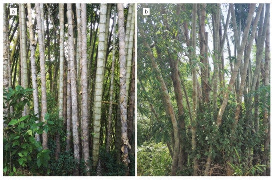 Vegetative forms of straight-culm (a) and bent-culm (b) Dendrocalamus sinicus.