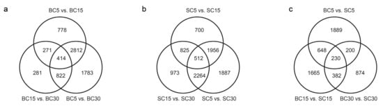 Overview of the serial analysis of differentially expressed genes (DEGs) identified by pairwise comparisons of the six transcriptomes: SC5, SC15, SC30, BC5, BC15, and BC30. (a) Venn diagram of the DEGs in bent culm (BC) at the three stages; (b) Venn diagram of the DEGs in straight culm (SC) at the three stages; (c) Venn diagram of the DEGs between BC and SC at the three stages.