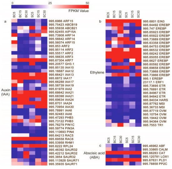 Heatmap of differentially expressed genes assigned to hormone signal transduction pathways in the six D. sinicus transcriptomes: BC5, BC15, BC30, SC5, SC15, and SC30. DEGs related to (a) auxin, (b) ethylene, and (c) abscisic acid. FPKM (fragments per kilobase of exon per million mapped reads) values range from 0 to 50.