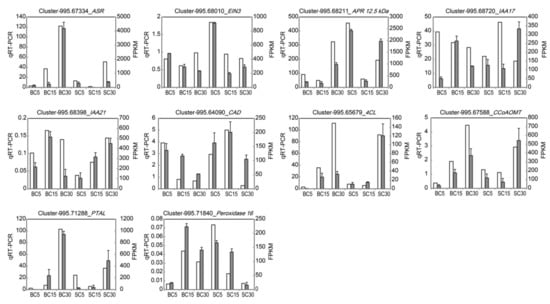 Expression of 10 selected genes as determined by qRT-PCR in comparison with the transcriptome results. The qRT-PCR values for each gene are the means ± SD of three biological replicates, with three technical replicates per experiment. The gene names and primers used for qRT-PCR analysis are shown in Table 1. The white bars indicate FPKM values as determined by transcriptome sequencing, and the grey bars show the expression as determined by qRT-PCR. ASR: abscisic acid stress ripening protein; EIN3: ethylene-insensitive protein 3; APR 12.5 kDa: auxin-repressed 12.5 kDa protein-like; IAA17: auxin-responsive protein IAA17-like; IAA21: auxin-responsive protein IAA21; CAD: cinnamyl–alcohol dehydrogenase; 4CL: 4-coumarate–CoA ligase; CCoAOMT: caffeoyl–CoA O-methyltransferase; PTAL: phenylalanine/tyrosine ammonia-lyase.