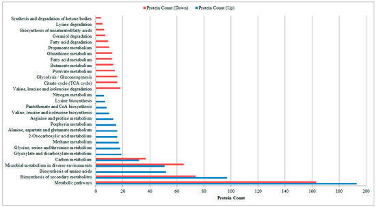 We then performed KEGG pathway enrichment analysis for these two clusters of proteins. There were 17 pathways enriched in the proteins in Cluster 1 (down-regulated expression), and 16 pathways enriched in the proteins in Cluster 2 (up-regulated expression). It should be noted that enrichment analysis was mainly used to retrieve the functional profile of a given gene/protein set (i.e., differentially expressed proteins here), which is generally performed by using statistical approaches to find classes of genes/proteins that are significantly over-represented (i.e., by comparison of their frequency to the whole genome) [26]. Therefore, the term “pathway” (or “metabolism”) merely represents that many proteins that are part of a specific metabolic pathway are identified here; it is neither necessarily a complete pathway nor a particular part of it (see Supplementary Tables S1 and S2 for the detailed lists). As illustrated in Figure 2, the most common pathways, including metabolic pathways, biosynthesis of secondary metabolites, microbial metabolism in diverse environments, and carbon metabolism, presented the large changes (i.e., much more proteins enriched in these pathways). Furthermore, the other enriched pathways only presented in one cluster (down-regulated expression or up-regulated expression). Down-regulated pathways included biosynthesis of unsaturated fatty acids (6 enriched proteins, false discovery rate (FDR): 3.76 × 10−2); butanoate metabolism (13 enriched proteins, FDR: 2.50 × 10−3); citrate cycle (TCA cycle) (16 enriched proteins, FDR: 9.39 × 10−7); fatty acid degradation (9 enriched proteins, FDR: 2.35 × 10−3); fatty acid metabolism (12 enriched proteins, FDR: 3.11 × 10−2); geraniol degradation (7 enriched proteins, FDR: 2.36 × 10−3); glutathione metabolism (12 enriched proteins, FDR: 2.37 × 10−2); glycolysis/gluconeogenesis (16 enriched proteins, FDR: 5.05 × 10−4); lysine degradation (5 enriched proteins, FDR: 4.81 × 10−2); propanoate metabolism (10 enriched proteins, FDR: 6.75 × 10−3); pyruvate metabolism (14 enriched proteins, FDR: 3.76 × 10−2); synthesis and degradation of ketone bodies (4 enriched proteins, FDR: 2.37 × 10−2); and valine, leucine, and isoleucine degradation (18 enriched proteins, FDR: 5.47 × 10−7). Up-regulated pathways included: 2-oxocarboxylic acid metabolism (16 enriched proteins, FDR: 1.54 × 10−5); alanine, aspartate, and glutamate metabolism (16 enriched proteins, FDR: 4.60 × 10−5); arginine and proline metabolism (13 enriched proteins, FDR: 0.0124); biosynthesis of amino acids (52 enriched proteins, FDR: 1.11 × 10−11); glycine, serine, and threonine metabolism (18 enriched proteins, FDR: 1.75 × 10−6); glyoxylate and dicarboxylate metabolism (19 enriched proteins, FDR: 7.40 × 10−6); lysine biosynthesis (7 enriched proteins, FDR: 4.31 × 10−2); methane metabolism (17 enriched proteins, FDR: 3.02 × 10−5); nitrogen metabolism (6 enriched proteins, FDR: 4.34 × 10−2); pantothenate and CoA biosynthesis (8 enriched proteins, FDR: 4.07 × 10−2); porphyrin metabolism (15 enriched proteins, FDR: 5.68 × 10−4); and valine, leucine, and isoleucine biosynthesis (10 enriched proteins, FDR: 4.29 × 10−4).