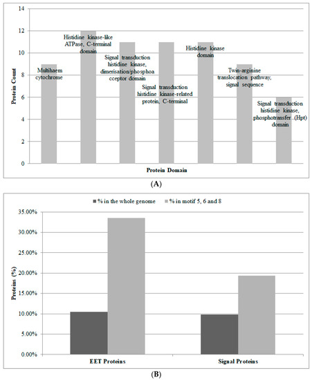 Figure 3. The proteins involved in network motifs 5, 6, and 8. (A) The protein domain enrichment, false discovery rate < 0.05. (B) The EET proteins and signal proteins (%) in network motifs 5, 6, and 8 vs. those in the whole genome of Shewanella oneidensis MR-1.