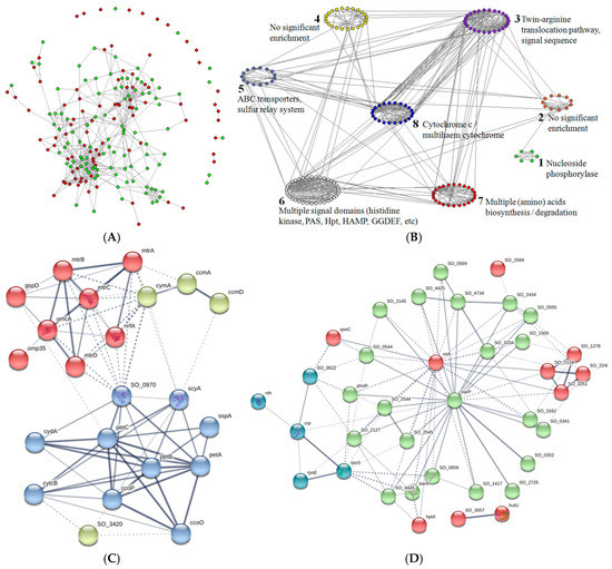 Figure 4. The functional modules in the proteins involved in network motifs 5, 6, and 8. (A) The protein interaction network generated by the R package igraph [23]; green nodes refer to the down-regulated proteins and red nodes refer to the up-regulated proteins. (B) The functional modules in the largest connected part of the protein interaction network; drawn by the Pajek program [61], modules are shown in distinct colors. (C) Module 8: multiheme cytochromes, and (D) Module 6: multisignal processing, which are generated by using the default parameters for the k-means cluster of these two modules in STRING (Search Tool for Recurring Instances of Neighbouring Genes) online tool [20,21], clusters are shown in distinct colors.