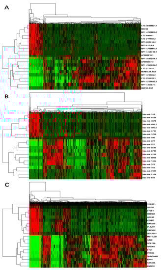 Heat-maps on expressions of top differential RNAs for thyroid cancer: (A) differential long non-coding RNAs (lncRNAs); (B) differential micro RNAs (miRNAs); and (C) differential messenger RNAs (mRNAs). X-axis represents samples, while Y-axis represents the biological elements studied.