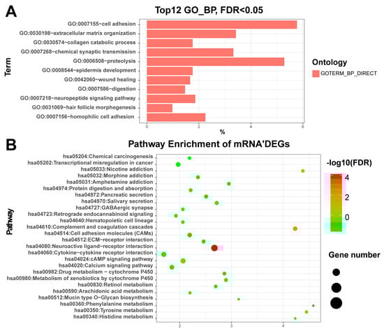 mRNAs: The functional enrichment analysis revealed that up-regulated DEGs were significantly enriched in the synthesis and degradation of extracellular matrix (ECM) related terms such as ECM organization (GO:0030198, FDR = ) and ECM disassembly (GO:0022617, FDR = 0.05), collagen catabolic process (GO:0030574, FDR = ), and cell adhesion (GO:0007155, FDR = ) (Table S3). Based on the pathway enrichment analysis, the over-represented pathways of up-regulated DEGs was Neuroactive ligand-receptor interaction (hsa04080, FDR = ) (Table S4). We also plotted the top enriched gene ontology (GO) and KEGG terms in Figure 2 for a better view. Our results are basically in line with Qiu et al. [5], especially ECM–receptor interaction, activation of MAPK activity and positive regulation of MAPK cascades [53].