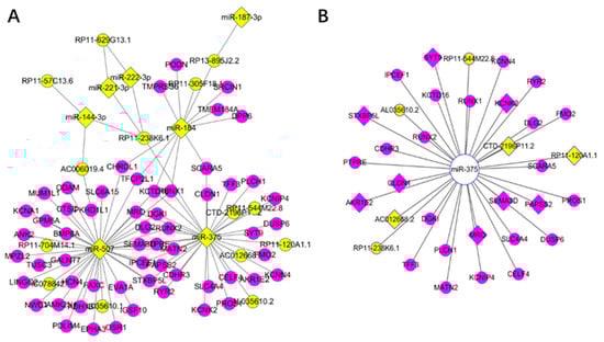 Key drivers for Thyroid carcinoma in the long non-coding competing endogenous database (lnCeDB): (A) yellow nodes represent miRNAs (diamond) and lncRNAs (ellipse), while the purple represent mRNAs; and (B) yellow nodes represent lncRNAs, purple represent mRNAs, and diamond represent significant RNAs in the survival analysis from key driver analysis (KDA) of the weighted correlation network analysis (WGCNA). The above relationship are competing endogenous (ceRNAs) from the lnCeDB database.