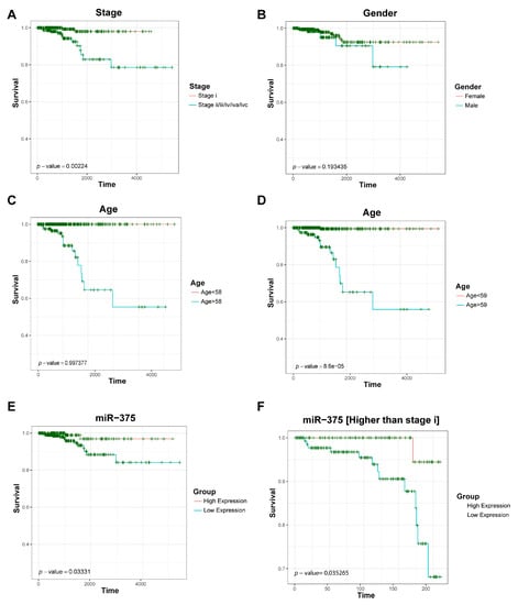 Thyroid patients’ survival analyses on miR-375 and a few clinical traits: (A,B) survival outcomes of different stages and gender; (C,D) different age groups have different effects on over-all survival; and (E,F) survival outcomes according to relatively high and low expression, of which (E) represents survival outcomes of has-mir-375 in all samples, and (F) represents survival outcomes of has-mir-375 in higher than stage I tumor.