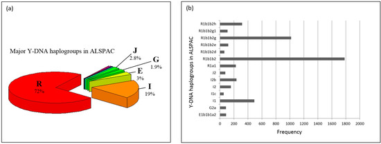 Figure 1a presents the Y-DNA haplogroups observed in ALSPAC. Y-DNA Clade/Haplogroup R is the most frequent (72%) and I the second most common Y-DNA haplogroup (19%). Y-DNA haplogroups subclades observed in ALSPAC are shown in Figure 1b. Most of the males in ALSPAC belong to the R1b1b2 (R-M269) haplogroup (over 3400 individuals) which is also one of the most common haplogroups in Europe [35]. Figure 2a,b presents the Y-DNA haplogroup profile of 1958BC. Five Y-DNA haplogroup were observed. Similar to ALSPAC, haplogroup R was the most frequent (74%), followed by haplogroup I (20%).