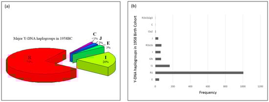 (a) Y-DNA haplogroups in 1958 Birth Cohort (Dataset: EGAD00000000022). The 1958 Birth cohort has individuals belonging to five major Y-DNA haplogroups (E, I, J, C, R), albeit two of the groups have less than 50 individuals in them. The clades E, I, J, C and R have 44 (3%), 296 (20%), 34 (2%), 1 (<0.1%) and 1078 (74%) individuals in them; (b) Y-DNA haplogroup frequencies in 1958BC (Dataset: EGAD00000000022) Similar to Figure 1a, 1958BC provides dense SNP data which enabled deeper haplogroup determination. The frequencies of haplogroups are 1, 1, 5, 34, 71, 60, 66, 165, 1006 and 44. R1b1b2g1: R-U198; I2a2: I-M26; R1b1b: R-P297.