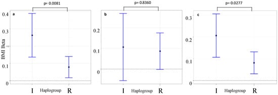Subgroup analysis comparing effect size of rs8050136 on BMI in two Y-DNA haplogroups. Results from (a) ALSPAC (b) 1958BC (c) ALSPAC and 1958BC combined. The statistics above represent p-values from the likelihood ratio test for interaction between Y-DNA haplogroup I and rs8050136. Heterogeneity tests (z-test) comparing Y-DNA haplogroups I and R yielded p-values of 0.005, 0.4169 and 0.014 for (a–c) respectively. ggplot2 package in R [36] was used to create the plot.