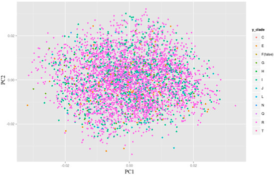Y-DNA haplogroup vs top two principal components (PCs) in ALSPAC individuals plotting the Y-DNA haplogroup clades on a principal component analysis (PCA) plot reveals that there is no apparent sub-clustering within the ALSPAC individuals. Thus, adding Y-DNA haplogroup information as covariates to control for additional population stratification in ALSPAC is not needed. Ggplot2 package in R [36] was used to create the plot.