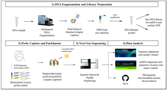 Novel probe capture next generation sequencing (NGS) assay for sequencing mitochondrial (mt) and nuclear DNA. To circumvent choosing between mitochondrial and nuclear analysis of degraded or limited forensic DNA samples, a capture enrichment based library preparation method can be implemented. In this method: (1) DNA libraries are prepared by fragmenting the DNA samples using Covaris® M220 Focused-ultrasonicatorTM (Covaris). DNA fragments are ligated with dual-index adapters, and the amplified DNA libraries are size-selected using SPRIselect® beads (Beckman Coulter Life Sciences, Indianapolis, IN, USA). (2) Shotgun libraries are enriched using a DNA probe based method of targeted capture enrichment for the whole mtgenome and eight categories of nuclear single nucleotide polymorphism SNP markers (426 SNPs). (3) The enriched samples are then sequenced on a NGS platform. (4) The nuclear SNP data is analyzed using NextGENe (SoftGenetics LLC, State College, PA, USA), while the mitochondrial data is analyzed using NextGENe, GeneMarker®HTS (SoftGenetics LLC), and Mixemt [50].