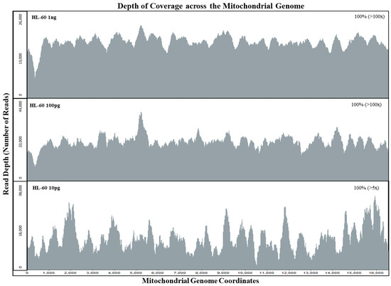 Depth of coverage across the whole mitochondrial genome for mtDNA sensitivity study samples. Limiting dilution of HL60 control DNA samples were tested with input DNA amounts of 1 ng, 100 pg, and 10 pg for the mtDNA sensitivity study. All HL60 samples exhibited full coverage of the mtgenome at >5× read depth (PCR duplicates removed using NextGENe® v.2.4.2).