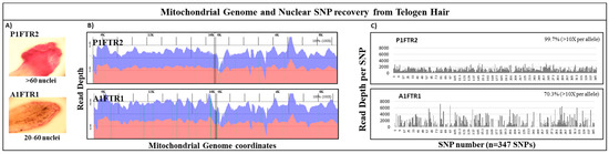 Recovery of mtDNA and nuclear SNPs from telogen hairs. (A) Microscopic images of stained telogen hair roots revealed that P1FTR2 exhibited >60 nuclei count while A1FTR1 exhibited 20–60 nuclei count. (B) mtgenome read depth plotted against mtgenome coverage coordinates was shown for P1FTR2 and A1FTR1. Blue coverage represents forward reads; red coverage represents reverse reads. Both P1FTR2 and A1FTR1 exhibited 100% coverage of the mtgenome at >100× read depth per base. (C) SNP coverage for P1FTR2 and A1FTR1 showed that P1FTR2 exhibited near 100% SNP coverage while A1FTR1 exhibited ~70% SNP coverage. Refer to Table S1 for details of the SNP numbers.
