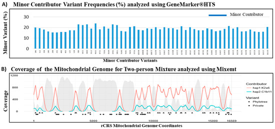 Similar contributor proportion estimation of the 80:20 mixture was observed using both the variant frequency based GeneMarker®HTS software and the phylogenetic based Mixemt software. The major and minor mutation reports from the GeneMarker®HTS analysis were used for a haplogroup search in EMPOP (EDNAP mtDNA Population Database) [56]. The major contributor with haplogroup K2a6 was estimated to be 79.58% and the minor contributor haplogroup C1b11 at 18.68% using the GeneMarker®HTS software (Table 6). All variants pertaining to the minor contributor, including both phylogenetic and private mutations, were accurately assigned by GeneMarker®HTS (Figure 6A). Mixemt directly yielded major contributor haplogroup K2a6 at 82.2% and minor contributor haplogroup C1b11 at 17.8%. While Mixemt successfully assigned mtDNA sequence fragments to the contributing major and minor haplogroups based on the phylogenetic variants (marked by triangles in Figure 6B), the software does not consider private mutations (marked by circles in Figure 6B). Overall, both GeneMarker®HTS and Mixemt were successful in separating and estimating the major and minor contributors in the observed 80:20 mixture. These results demonstrated the robustness of our probe capture panel to capture minor contributor sequences with ~20% of ~300,000 mtDNA copies. In general, future mixture de-convolution can be most reliably achieved by using both frequency based, when possible, and phylogenetic based software to better characterize and understand private and phylogenetic variants in the human mtgenome.