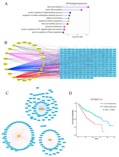 Hub gene PPARGC1A was associated with LIHC patient prognosis. (A) GO enrichment for the five DEMs matched genes. y-axis represents GO terms and x-axis represents fold enrichment (with −log10 p-value); (B) The interaction network of 22 DEGs which have significant effects on patient survival. Yellow boxes: DEGs; blue boxes: reported gene in human; (C) Subnetwork of three hub nodes including gene PPARGC1A, CAT, and SCP2; (D) Gene PPARGC1A was able to significantly distinguish the overall survival of LIHC patients. PPARGC1A: Peroxisome proliferator-activated receptor gamma coactivator-1 alpha; GO: Gene Ontology; CAT: Catalase; SCP2: Sterol carrier protein 2.