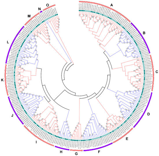 To analyze the evolutionary relationships among the StbHLH members, 124 StbHLH proteins were aligned with 135 bHLH proteins from Arabidopsis [28] using ClustalX 1.83 [65]. An unrooted phylogenetic tree was constructed by MEGA6. In total, 259 bHLH protein sequences were classified into 15 distinct groups, which were named from A to O (Figure 2). The result corroborated the previously proposed classification of the bHLH family [27,66]. Group A was the largest subfamily with 34 proteins, while the smallest, Group N, contained only two proteins, both bHLH proteins (AT1G22380 and AT5G50010) were from Arabidopsis. StbHLH proteins were more closely related to those in the same subfamily from Arabidopsis than with the other bHLH proteins from potato. Most StbHLH proteins in the same group shared consensus motifs, and similar exon–intron structures within the corresponding genes (Table S4). For instance, 10 StbHLH genes in Group I contained two or three introns, with four genes having two introns and the others having three. Genes with the same number of introns only varied in lengths of exon and non-coding regions. Additionally, the 10 proteins in Group I shared the same motif arrangement of motifs three, four and six, except for StbHLH39 and StbHLH121, which lacked motif 6, and in StbHLH49, which had motif 1 instead of motif 3. A few of the clades of the phylogenetic tree were supported by low bootstrap values, which may be caused by relatively less informative character positions outside of the short and highly conserved bHLH domains [33].