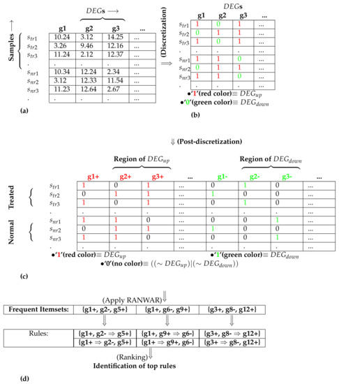 We now have four categories of genes: (i) (denoted by 1 in ); (ii) (denoted by 0 in ); (iii) ; and (iv) ∼. As any rule mining technique considers only 1, not 0, post-discretization was required in order to represent the aforementioned four types of genes using only two binary digits (i.e., 1 and 0). For the post-discretization, the number of columns (genes) was doubled while the first half of them denoted the region of , and the second half of them denoted the region of . For the first half, 1 showed property, and 0 denoted ∼ property (see Equation (5)). For the second half, 1 showed property, and 0 denoted ∼ property (see Equation (6)).