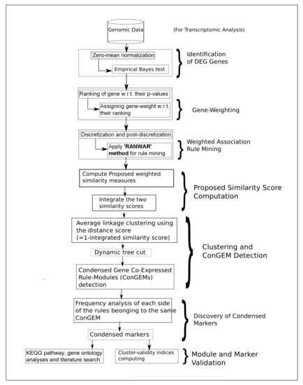 However, the top markers were then identified. We then performed a literature search as well as KEGG pathway and Gene Ontology enrichment analyses using the “Enrichr” database [33] for validating the resultant markers. If any related literature evidence or any related KEGG pathway or GO-term or both indicating the involvement between the disease and each participating gene belonging to any marker were found, the marker was treated as “existing”; whereas, if no literature evidence or pathway or GO-term supporting the association between the disease and any participating gene of a marker was obtained, the marker was treated as “novel”. Of note, two important articles related to disease-specific pathway extraction are [34,35]. Finally, the steps of the proposed algorithm are represented in Figure 2 for better visualization.