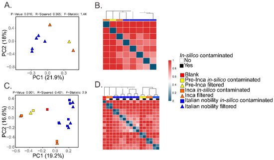 To assess if the OTUs present in the blank control affected the interpretation of the previous results, we ran the biom summarize-table script to assess the total number of counts or sequences per sample. The pre-Inca/Inca mummies showed 78,903 (mummy FI3); 24,956 (mummy FI9); and 56,971 (mummy FI12) counts or sequences per sample. When running the script for the Italian nobility mummies, 32,086 (mummy NASD3); 44,255 (mummy NASD14); 60,266 (mummy NASD22); 24,633 (mummy NASD27); and 101,517 (mummy NASD29) counts or sequences per sample were identified. The blank control showed 3824 counts or sequences. To address if the 3824 counts or sequences identified in the blank control could affect the separation of the 16S data based on culture, we filtered the OTUs present in the blank control from the biom table of the mummies using the script filter_otus_from_otu_table.py. The total number of counts or sequences pre- and post-filtering are reported in Table 2. The number of OTUs in the blank control is also shown in Table 2. As stated, the number of OTUs in a blank control can differ depending on how it was processed. We also added the OTUs identified in the blank control to the filtered OTU table to mimic in-silico contamination. Briefly, OTU tables from the mummies and the blank control were merged using the merge_otu_tables.py script available in the Quantitative Insights Into Microbial Ecology (QIIME) package [26]. We then performed diversity and taxonomical analyses using the core_diversity_analyses.py script in QIIME. Results of the filtered samples virtually demonstrate similar dynamics as shown in our previous paper, which included non-filtered samples. Pre-Inca/Inca mummies showed lower observed Operational Taxonomic Units (OTUs) (Figure 1A) and evenness (Shannon diversity index) (Figure 1B) values compared to the Italian nobility mummies. In-silico contamination of the mummies OTU tables showed no significant differences in the alpha-diversity when looking at both observed OTUs (Figure 1C) and evenness (Shannon diversity index) (Figure 1D). Beta diversities were visualized as Principal Coordinate Analyses (PCoA) plots and showed a statistically significant separation of the data based on culture (Bray-Curtis index; the P-value, R-squared, and F-statistic values are shown (PERMANOVA test); Figure 2A). Hierarchical cluster plots of the beta-diversity (Bray-Curtis index) also showed a clear separation of the data based on culture (Figure 2B). Beta-diversity (Bray-Curtis index), visualized as PCoA plots, of the in-silico contaminated mummies OTU tables showed a separation of the data based on culture (The P-value, R-squared, and F-statistic values are shown (PERMANOVA test); Figure 2C). Hierarchical cluster plots showed that one of the Italian nobility mummies and one the Inca mummies did not cluster with the corresponding culture. This may suggest that in-silico contamination of the mummies OTU tables may affect, to some extent, the beta-diversity of certain samples. Heatmaps of the relative abundances of bacterial OTUs at the order level showed a separation of the data based on culture, except for the pre-Inca mummy (FI9), but closely resembled the Inca mummies (Figure 3A). We also performed the analysis at the genus level and noticed a separation of the data based on culture (Figure 3B). Heatmaps of the relative abundance of bacterial OTUs at the order level of the in-silico contaminated mummies OTU tables showed that two of the Italian nobility mummies microbiomes did not cluster with the rest of the Italian nobility microbiomes (Figure 3C). Similar outcomes were observed at the genus level (Figure 3D). This may suggest that in-silico contamination of the mummies OTU tables may affect, to some extent, clustering of the taxonomic data. These results support our previous study and suggest that OTUs present in a blank control may not necessarily affect the structure of a microbiome of interest.