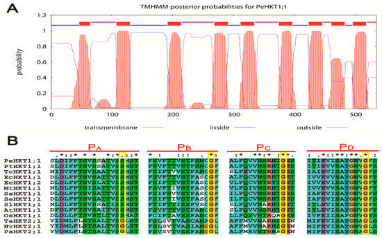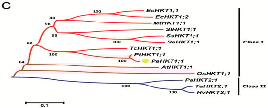 The HKT proteins contain four membrane–pore–membrane motifs, each consisting of a P-loop between two transmembrane domains (M1 and M2), which are associated with the K+ channel [36,37]. Further research has demonstrated that the HKT1 transporters are Na+-specific transporters and have a S–G–G–G signature, whereas HKT2 transporters are Na+–K+ co-transporters and have a G–G–G–G type, due to a Gly residue that is crucial for K+ selectivity in the first P-loop domain [38,39]. In this study, we applied TMHMN to predict the transmembrane helices of PeHKT1;1 protein, which showed that it contained eight distinct transmembrane domains (Figure 1A), consistent with the previous reports. Moreover, the sequence alignment and phylogenetic analysis suggested that PeHKT1;1 protein had a S-G-G-G signature for the P-loop domains and belonged to class I of HKT transporters (Figure 1) [11].