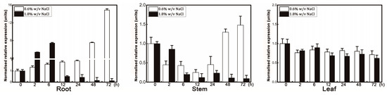 Expression level of PeHKT1;1 in “Nanlin895” poplar under NaCl stress. Six-week-old poplar plants were treated with 0.6% and 1.8% w/v NaCl solution for 0, 2, 6, 12, 24, 48, and 72 h, and roots, stems, and leaves were harvested for qRT-PCR assay. Standard deviations were calculated from three independent qRT-PCR experiments.
