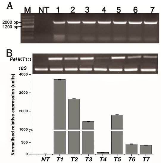 To further investigate the potential functions of PeHKT1;1 in Populus, we generated some PeHKT1;1-overexpressing transgenic lines of P. davidiana × P. bolleana by Agrobacterium-mediated leaf disk transformation, and seven independent transgenic lines were randomly selected for further testing. The sizes of PCR amplified genomic fragments from seven transgenic poplar lines were obtained by RT-PCR, which were confirmed with the expected sizes, containing the PeHKT1;1 and partial vector sequences (Figure 4A). A control (NT plant) did not show any amplification band based on the transgene. The result implied that the Pro35S::PeHKT1;1 vector was successfully integrated into the poplar genome. qRT-PCR further demonstrated that expression levels of PeHKT1;1 were 48–3720 times higher than in NT poplar under normal conditions (Figure 4B). These results indicated successful integration and expression of PeHKT1;1 in the seven transgenic poplar lines.
