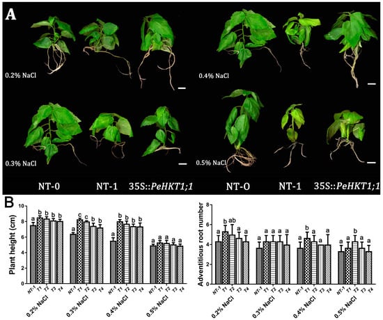 Phenotypes of NT poplar and PeHKT1;1 transgenic lines under salt stress conditions. Six-week-old non-transgenic (NT) and four transgenic poplar lines (T1, T2, T3, and T4) were treated with 0.2, 0.3, 0.4, and 0.5% w/v NaCl for two weeks. (A) Phenotypic observation of NT and transgenic poplar lines. The unstressed NT poplar (NT-0) were the positive control and NaCl-treated NT poplar (NT-1) was the negative control. All treatments had three biological replicates. Scale bar represents 1 cm. (B) The statistical analyses of plant height and adventitious root number. Data were analyzed using one-way ANOVA followed by Duncan’s test. Error bars with letters represent significant differences (p < 0.05, Duncan’s test).