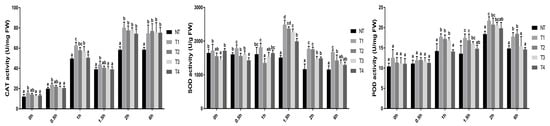 Catalase (CAT), superoxide dismutase (SOD), and peroxidase (POD) activities of four transgenic poplar lines (T1, T2, T3, and T4) and non-transgenic (NT) poplar. Three-year-old soil-grown poplar plants were subjected to 0.8% w/v NaCl at different time points (0, 0.5, 1, 1.5, 2, and 6 h). Data were analyzed using one-way ANOVA followed by Duncan’s test. Error bars with letters represent significant differences (p < 0.05, Duncan’s test).