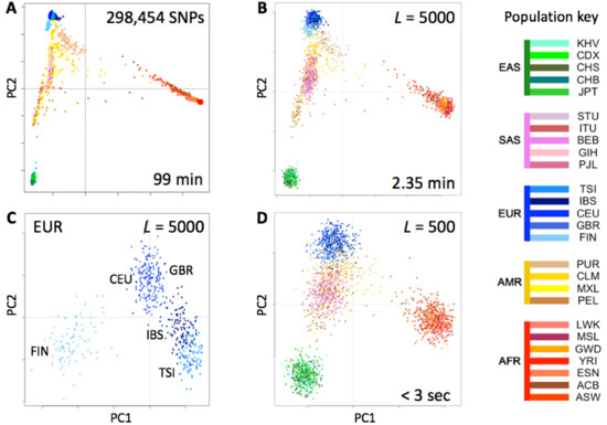 We tested the utility of genotype fingerprints for population studies. We extracted genotypes for all 2504 individuals of the 1000 Genomes Project cohort from their VCF-format genomes using the 23andMe V3 SNP list, fingerprinted each extracted genotype, and used PCA to reconstruct the known population structure (Figure 3). This entire process required a fraction of the time and memory to perform the same task using a more standard approach (see Methods). As expected, the quality of the reconstruction depended on fingerprint resolution (L): fingerprints with L = 5000 yielded excellent population structure reconstruction, comparable to the results of population reconstruction using high-resolution genome fingerprints (compare Figures 3 and 5 from Glusman et al. [7]). Genotype fingerprints with smaller values of L yielded progressively lower-resolution results at proportionally higher speeds (seconds rather than more than an hour, Figure 3). Analysis of only the closely related European populations (Figure 3C) showed the same separations apparent in analyses of a limited number of SNPs (not shown): full separation of the Finns (FIN), the Northwestern Europeans: Utah Residents with Northern and Western European Ancestry (CEU), British in England and Scotland (GBR), and the Mediterraneans: Iberians in Spain (IBS), Toscani in Italy (TSI), with less separation of IBS from TSI and essentially none between CEU and GBR. Thus, genotype fingerprints retain differences at both large and small scales, allow a suitable balance between resolution and speed, and support scaling of population structure studies to whole population-scale genotype data, without requiring analysis of linkage disequilibrium and other complications prior to analysis.