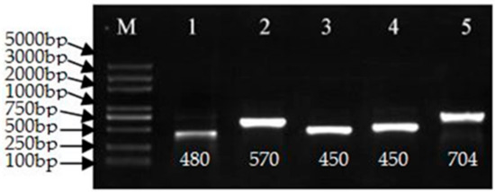 The pCaLFGmFNLFG vector was evaluated by PCR using the primers listed in Table S2 and sequenced. Electrophoresis of the PCR products confirmed the expected fragment sizes. The vector was transformed into the Agrobacterium tumefaciens strain GV3101 by the freeze-thaw method. The strain was verified by PCR, as shown in Figure 2, the fragment was 480, 570, 450, 450, and 704 base pairs (bp), respectively, as expected and then sequenced. It used for transformation when the sequence was correct.