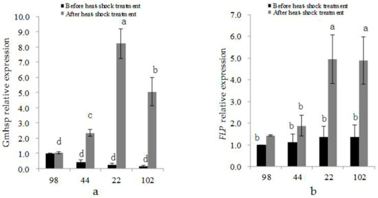 Expression of (a) Gmhsp17.6-L and (b) FLP before and after heat-shock treatment in transgenic lines 98-3-2 (98), 44-3-1 (44), 22-2-2 (22), and 102-2-2 (102).