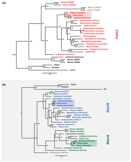 To demonstrate the biological value of the omics datasets, we next investigated the key enzymes of LC-PUFA biosynthesis in the sardine draft genome and liver transcriptome, a major metabolic site for PUFA metabolism [15]. More specifically, we investigated the repertoire and function of genes encoding fatty acyl desaturases (Fads) and elongation of very long chain fatty acid (Elovl) proteins with pivotal roles in LC-PUFA biosynthesis [3]. Among fads, our data shows that the European sardine possess one single fads-like gene that was confirmed to be orthologous of fads2 (Figure 3A,C) (for details see Supplementary Materials and Methods in Supplementary File 1 and Supplementary File 4). Our microsynteny analyses shows the conservation of the reconstructed locus, when compared to C. harengus, and further suggests the absence of fads1 from sardine’s genome, in agreement with the loss of this tandem gene duplicate during teleost evolution (Figure 3C, Supplementary Tables S5 and S6 in Supplementary File 2) [16]. Among elovl, we identified two elovl-like sequences, namely elovl2 and elovl5, with well-known roles in LC-PUFA biosynthetic pathways (Figure 3B). Again, microsynteny conservation was found in the reconstructed loci. While elovl5 is present in virtually all teleosts [3,60], elovl2 has only been described in a few of species, and is reported to be lost in the Neoteleostei [60]. Thus, the presence of an elovl2 gene in sardine is consistent with the phylogenetic location of this species within the Otomorpha group, to which species with characterized elovl2 belong [61,62]. Accession numbers for the herein isolated fads2, elovl2, and elovl5 gene orthologs have been deposited in GenBank (Supplementary Table S1 in Supplementary File 2), and are located within genome scaffold numbers: fads2—scaffolds scf7180014809123 and scf7180014798914; elovl2—scaffold scf7180014826570; and elovl5—scaffolds scf7180014798588 and scf7180014802726 (for details see Supplementary Materials and Methods in Supplementary File 1 and Supplementary Table S5 in Supplementary File 2).