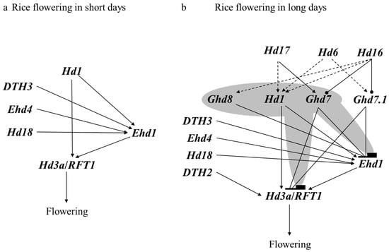 Combined with the latest research findings, a draft regulatory network of how these QTLs/genes coordinate to determine rice flowering time is suggested (Figure 1). The key regulators of flowering are the florigens Hd3a and RFT1, which are expressed in leaves, and then move to the shoot to accelerate flowering [105,106,107,108]. Hd1 only triggers the expression of florigen genes directly in leaves, but it can switch to repress the expression of florigen genes when Ghd7 and Ghd8 are present in long days [126,127,128,129,130]. Ehd1 also triggers the expression of florigen genes independently of Hd1; moreover, it is regulated by Ghd7, Ghd8, Ghd7.1, Ehd4, DTH2, DTH3, and other flowering genes [101,109,111,112,116,118]. In addition, other regulators that are dependent on these major genes have been identified as contributing to flowering. Hd17 is a component of the circadian clock that delays flowering, depending on Hd1 [104]. Hd6 and Hd16 encode kinase and directly phosphorylate GHD7 and GHD7.1, and interact genetically with Ghd7, Ghd7.1, Ghd8, and Hd1 to further delay flowering [113,114,131]. Even more extreme, there are two combinations that lead to non-flowering in natural long days. One is the combination of functional Hd1, Ghd7, and Ghd8 in Zhenshan97, while another includes non-functional ehd1 and rft1 in both the Nona Bokra background and a recombinant inbred line derived from Guangluai 4 and Taichung 65 [126,132,133]. Taken together, these studies show that cultivars with different combinations of known flowering genes can exhibit extensive variation in the heading date, from earlier flowering to extremely later flowering or even non-flowering on long days. On short days, only a few genes such as Hd1, Ehd4, DTH3, and Hd18 still promote flowering as they do on long days, while most others have weak effects or even no effect such as Ghd7, Ghd7.1, Ghd8, Hd17, and DTH2 [100,104,109,111,116,117,118,127,128,129].