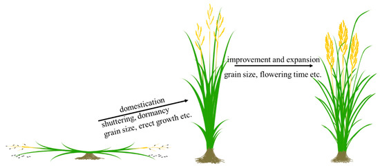 A suite of common traits is selected during the domestication of crops, which are collectively known as a “domestication syndrome”. These traits make domesticated species different from their wild ancestors. In cereals, these traits include morphological traits such as larger grains, a loss of seed dispersal, increased apical dominance, more determinate growth, and physiological traits including seed dormancy, seed shattering, bitter substances in edible structures, photoperiod sensitivity, and synchronized flowering [1]. The seed-related traits of dormancy, seed shattering, and grain size determine which kinds of grain humans can choose for domestication, and the photoperiod-sensitive heading date limits the optimal growing region of rice. Rice is a model crop plant due to its small genome size, high-quality genome sequence, and efficient transformation [2]. In the last two decades, many genes that are related to domestication and global expansion have been isolated in rice. In this review, we summarize the genes controlling seed dormancy, seed shattering, grain size, and flowering time, which contribute to rice domestication and its global expansion. In addition, the homologues in other crops are also discussed to verify parallel evolution during domestication.