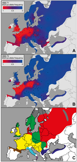 Geographic distribution of the β52Cys allele at HBB-T1 (A) and HBB-T2 (B) shown as interpolated allele frequency surfaces. Dots represent the location of population samples. Data for Britain were taken from [25]. (C) mtDNA lineages distribution modified from [36]. Western lineage in yellow, Carpathian lineage in green, Eastern lineage in red, Balkan lineage in dark blue, Italian lineage in light blue, Calabrian in violet, Pyrenees lineage in brown and introgressed mtDNA from Clethrionomys rutilus in grey colour.