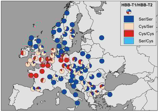 The linkage phase of the codon 52 polymorphic site between the two HBB genes could be resolved unambiguously for all voles (posterior probability of 0.99–1.0). All four possible two-locus (HBB-T1/HBB-T2) haplotypes were detected. However, the haplotype Ser/Cys was only present in two voles from the Czech Republic and one vole from southern Italy and only in heterozygous state SerSer/SerCys (n = 3; frequency 0.003). The other three haplotypes were present in high frequencies throughout Europe (Figure 2), with haplotype Ser/Ser being the most frequent (n = 590; 0.58), followed by Cys/Ser (n = 233; 0.23) and Cys/Cys (n = 184; 0.18). Therefore, due to the rarity and restricted pattern of haplotype Ser/Cys (Figure 2), the distribution of the Cys allele at HBB-T2 is governed by the distribution of haplotype Cys/Cys, while the distribution of the Cys allele at HBB-T1 is determined by the combined distribution of haplotypes Cys/Ser and Cys/Cys (Figure 2).