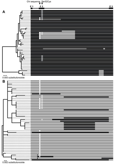 Maximum likelihood (ML) phylogenies based on the HBB-T1 (A) and HBB-T2 (B) alignments to the left of the recombination breakpoints identified by SBP. Haplotypes are represented by whole gene sequences with mapped conversion tracts. In HBB-T1, tracts identified by the method of Betrán et al. [56] are in light grey, tracts identified by GENECONV are in dark grey. The locations of the β-globin polymorphic site 52 and of the Chi sequence (see Section 4.2.) are depicted by arrows. Exons are marked by rectangles above the alignment.