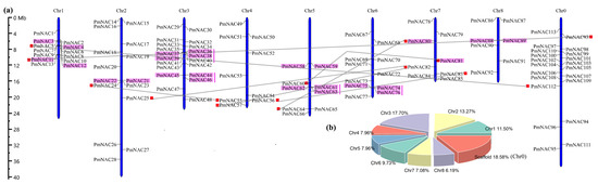 Locations of 113 PmNAC genes on chromosomes were mapped, showing that 93 PmNACs were located on chromosomes, and 21 PmNAC genes were located on scaffolds (Figure 1a). Chromosomes 1, 2 and 3 possessed 13 (~11.50%), 14 (~13.27%), and 20 (~17.70%) genes, respectively, while the proportion of PmNAC members on other chromosomes was less than 10%, ranging from 6.19% to 9.73% (Figure 1b). PmNAC genes on chromosomes 1 and 3 were clustered in the center of chromosomes. The uneven distribution of PmNAC on chromosomes reflected the diversification and complexity of NAC gene family.