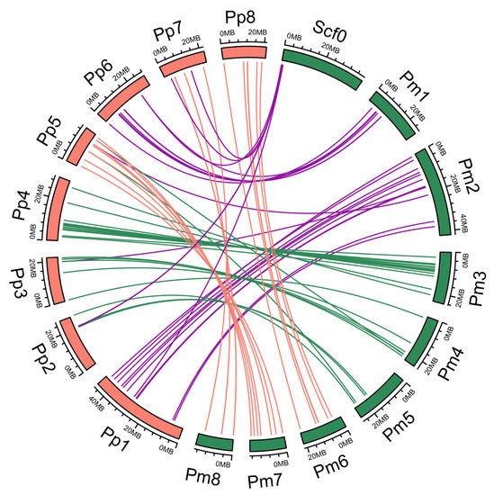 Syntenic analyses of NAC genes in P. mume (Pm) and P. persica (Pp). Green and orange blocks present P. mume and P. persica chromosomes, respectively. Lines denote syntenic NAC gene pairs on the chromosome. Purple lines present syntenic PmNACs in scaffolds, Pm1 and Pm2; green lines present syntenic PmNACs in Pm3, Pm4 and Pm5; orange lines present syntenic PmNACs in Pm6, Pm7 and Pm8.