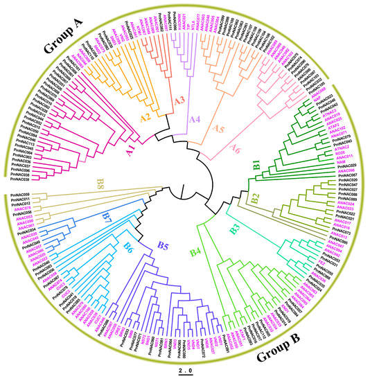 Phylogenetic analysis of NAC genes from P. mume and Arabidopsis thaliana. The maximum likelihood (ML) phylogenetic tree was generated by RAxML version 8 software using optimal JTT (Jones–Taylor–Thornton) models with gamma distributed rates. The Phylogenetic tree was divided into two groups (Groups A and B) and fourteen subgroups (Subgroups A1–6 and B1–8). Each subgroup is distinguished by a different color. Pink color presents NAC genes in A. thaliana.