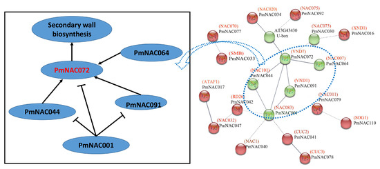 Protein interactions give us important clues in understanding gene function on a system-wide level [90]. According to the protein interaction networks, we found that PmNAC072 and PmNAC091 are similar to VNDs in Arabidopsis, which are involved in secondary wall biosynthesis [70]. PmNAC001, PmNAC044, PmNAC091 and PmNAC064 were associated with NAC083, NAC101, VND1 and NAC007, respectively, which were predicted to have a strong interaction with PmNAC072 (Figure 4). Among them, NAC101, NAC007 and VND1 can positively regulate VND7 [70], but NAC083 is a transcriptional repressor of VND7, VND1 and NAC101 and negatively regulates the formation of xylem vessel [71]. PmNAC017 was the homolog of ATAF1 that functioned in response to ABA, salt, drought, cold and oxidative stress [91,92]. PmNAC041 was more functionally related to CUC2, which was involved in plant growth and development [93], and was predicted to interact with CUC3. Based on these results, we speculate that these interaction proteins play crucial roles in regulating the xylem vessel differentiation, plant development and stress-response.